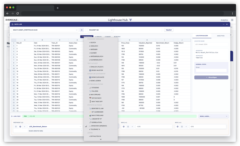 Deterministische Prüfung: Unsere Engine wendet Ihre definierten Regelwerke (Locators & Rules) auf die Daten an.