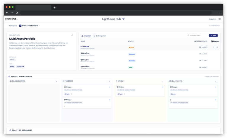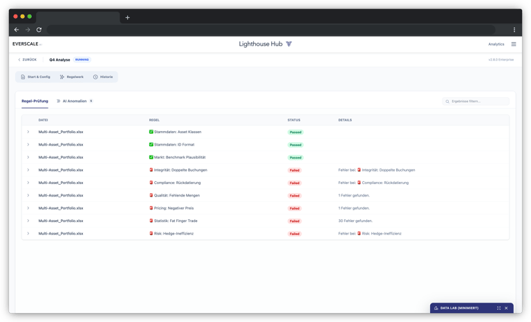 Audit Trail: Jede durchgeführte Analyse wird unveränderbar protokolliert (Wer? Wann? Welches Regelwerk?). Dies ermöglicht lückenlose Nachweise bei Wirtschaftsprüfungen.